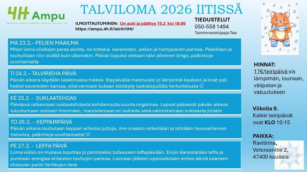 Talviloman leiri ilmoittautuminen on alkanut. Ilmoittautuminen päättyy 15.2 klo 18:00