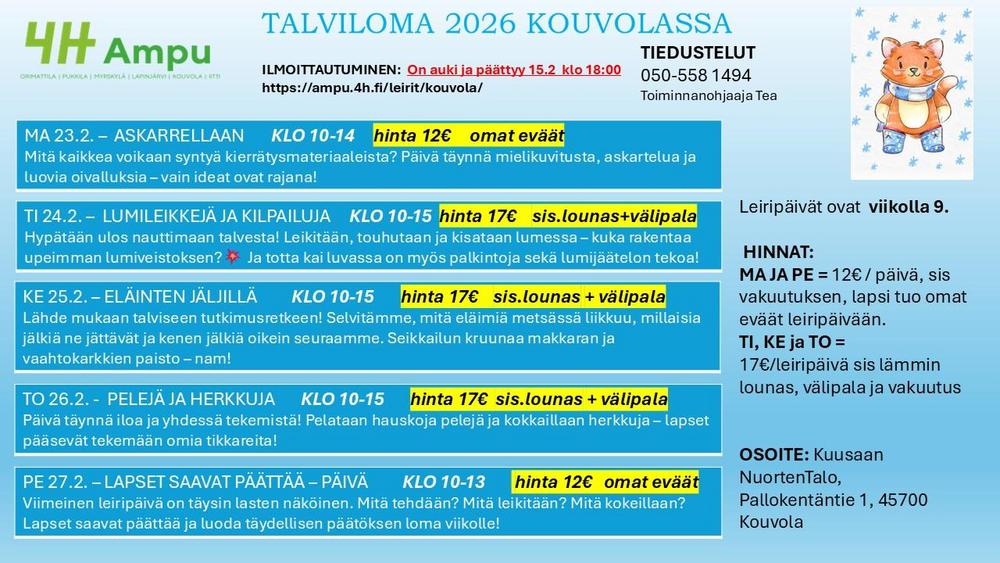 Leirimaksut: Maanantai 23.2 ja perjantai 27.2 = 12€ / pv