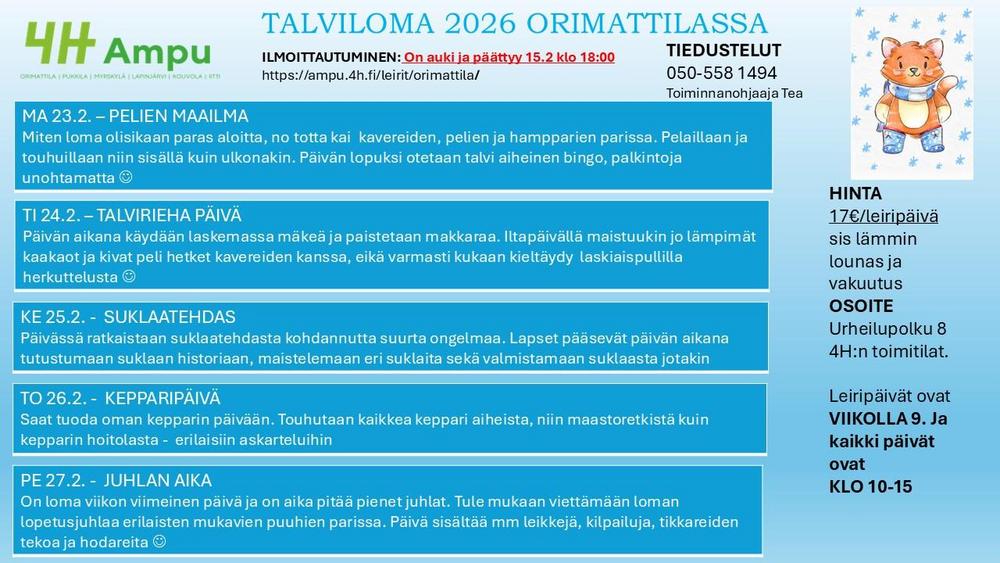 Talviloman viikon 9 leiri ilmoittautumiset ovat auki. Ilmoittautuminen päättyy 15.2 klo 18:00